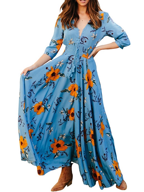 Bohemian Floral Random Print V-neck 3/4 Sleeve Buttons Maxi Dress