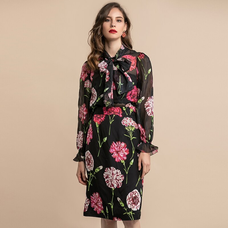 Elegant Floral Print Vintage Skirts Two Pieces Sets