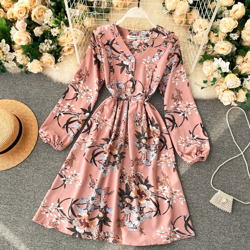 Sexy V Neck A-Line Puff Sleeve Elegant Flowers Dress