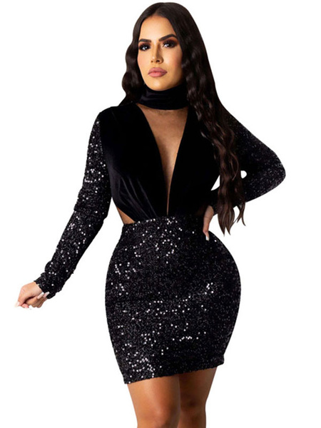 High Collar Sequins Long Sleeves Velour Sexy Bodycon Club Dress
