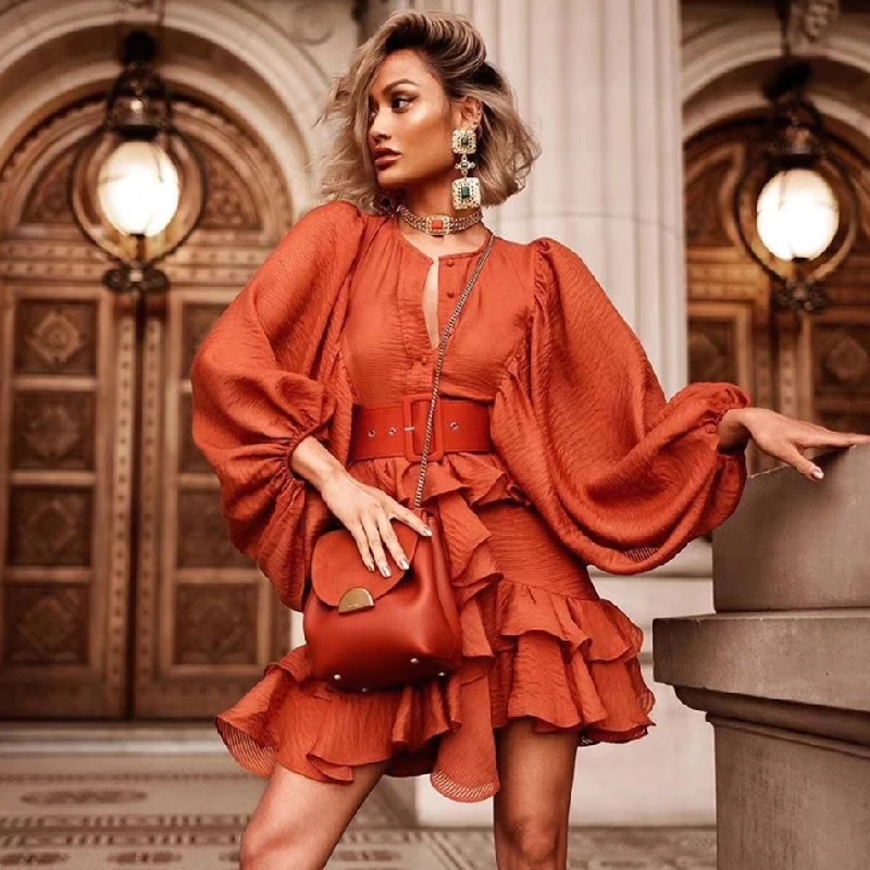 Sexy Sashes Lantern Sleeve Cascading Ruffle Elegant Dress