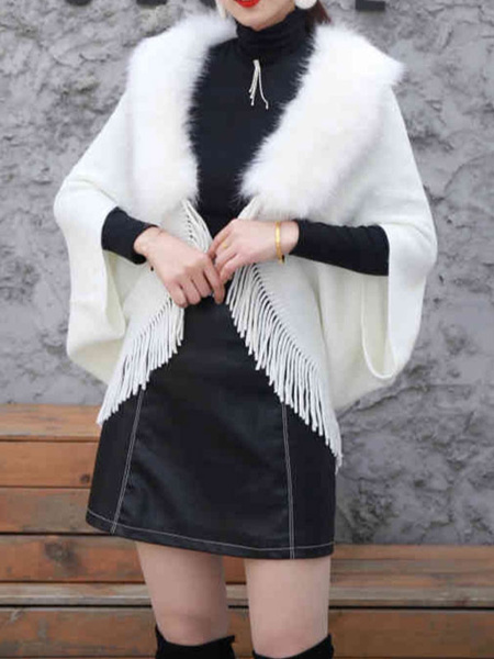 Faux Fur Poncho Turn Down Collar Layered Fringe Cape