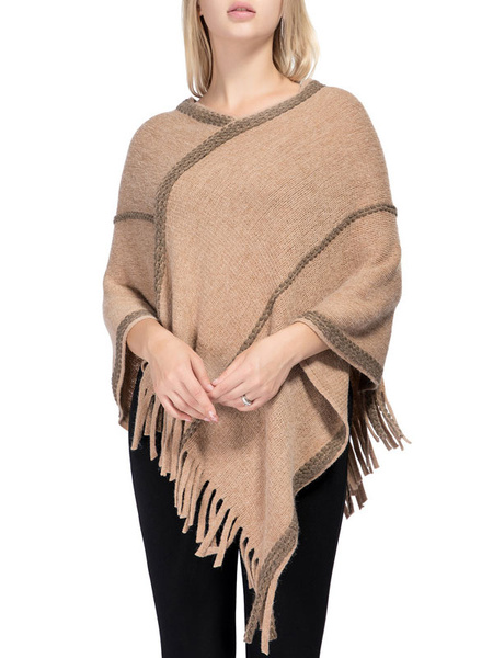 Poncho Jewel Neck Layered Fringe Color Block Cape