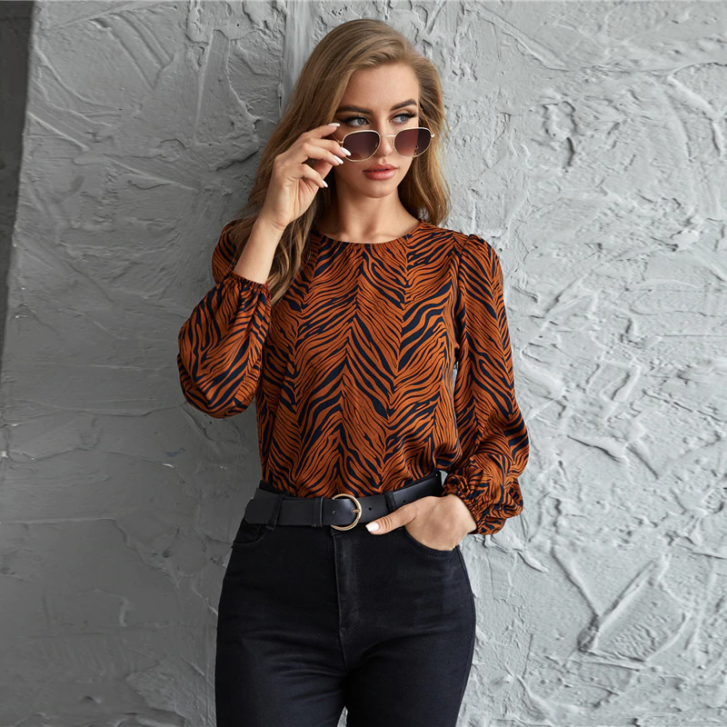 Allover Print Keyhole Back Lantern Sleeve Top