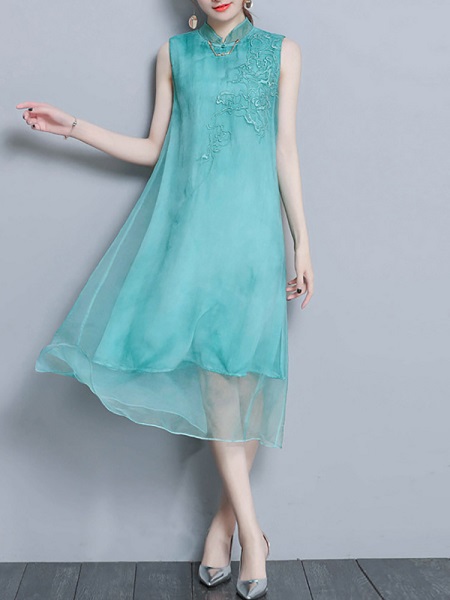 Embroidery Sleeveless Stand Collar Vintage Dress