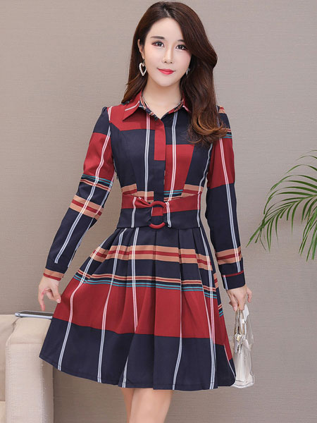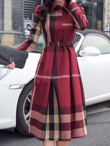 Plaid Shirt Dress Long Sleeve Turndown Collar Long Dress