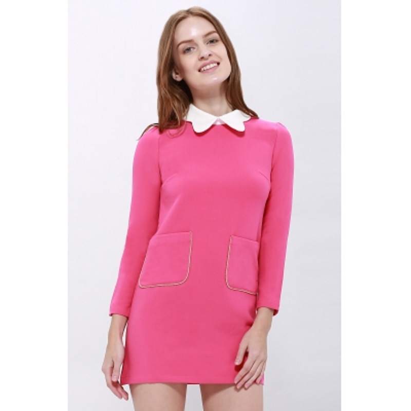 Simple Design Peter Pan Collar Pockets Embellished Long Sleeve Cotton Blend Dress