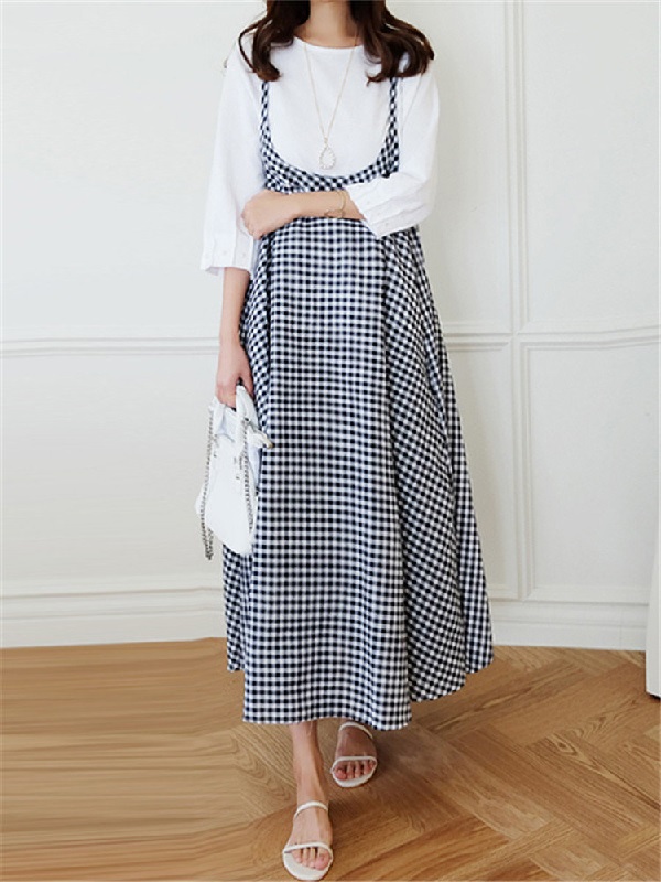 Vintage Print Plaid Spaghetti Straps Loose Maxi Dress