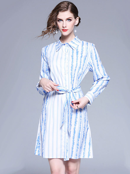 Blue Shirt Dress Turndown Collar Long Sleeve Striped Midi Dress