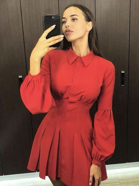 Long Sleeve Shirt Dress Pleated Swing Dress