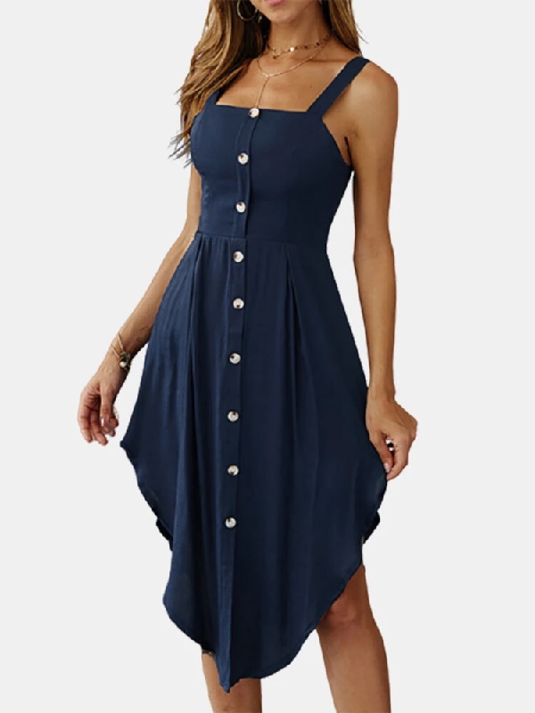 Solid Color Straps Sleeveless Irregular Hem Button Shirt Dress