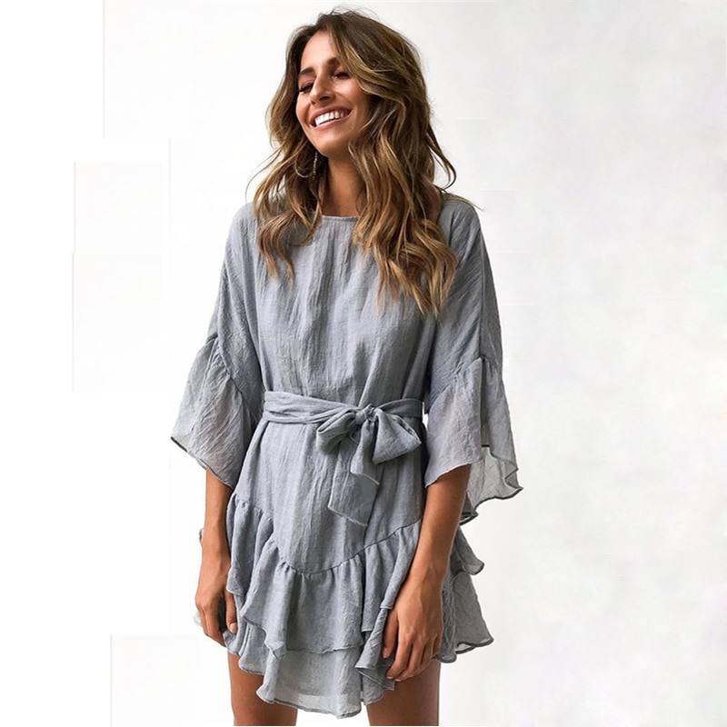 Women Spring O-neck Elegant Bow Tie Up Summer Beach Dresses