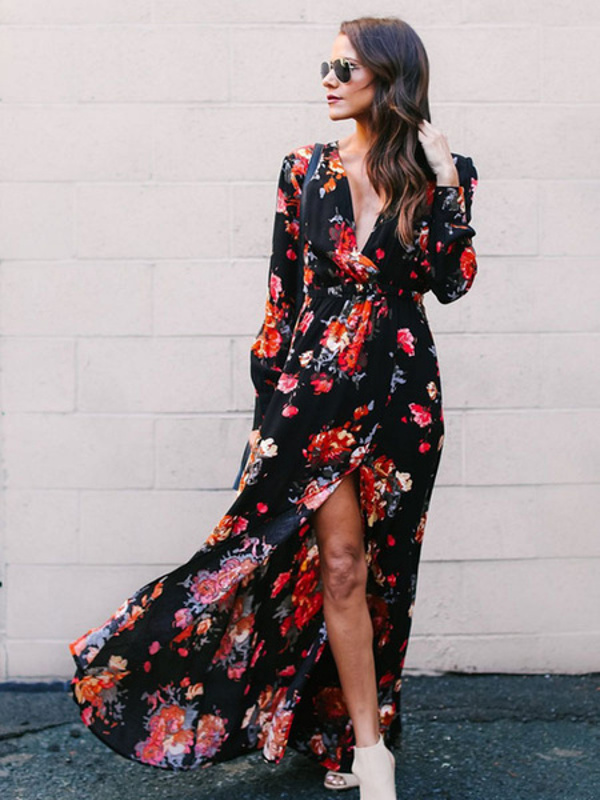 Floral Long Sleeve Tea Split Tie Waist Maxi Dresses