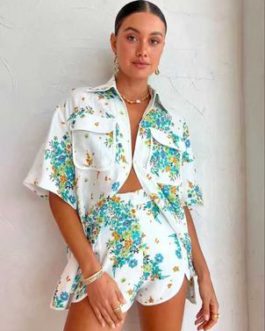 White Floral Print Resort Wear Lace Up Sexy Two Piece Sets