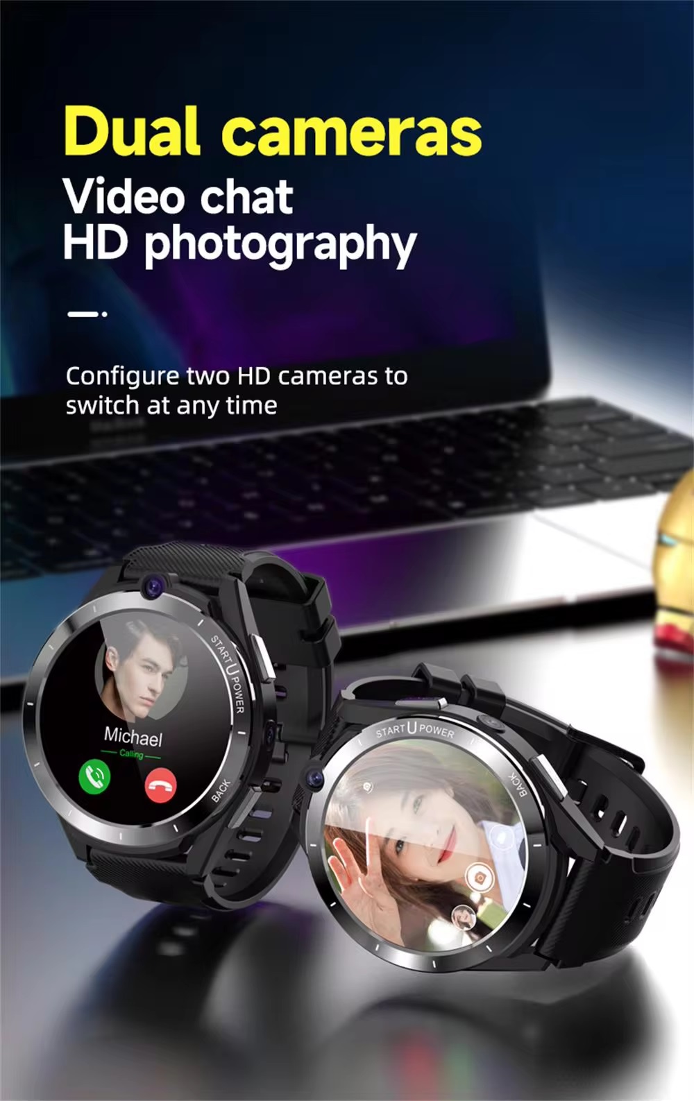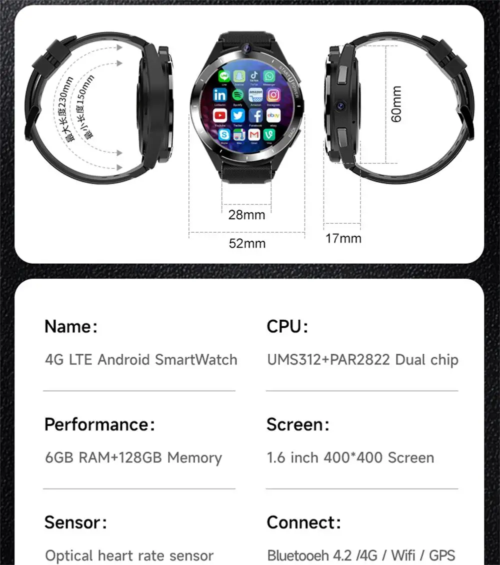 1. 4G all Netcom, global call; 2. Ums312 +par2822 dual chip, social + sports, more power-saving and more accurate movement; 3.Android 11, the world’s first high-performance system, has smoother operation and safer information; 4. 6+128GB, large memory, arbitrary installation; 5. 1.6 inch 400*400 resolution HD full round screen, with ultra-high screen accounting for the proportion; 6. The top 2million / main 8million HD cameras make self shooting / scenery more convenientï¼› 7. Ceramic bezel /pu strap, high-end fashion.