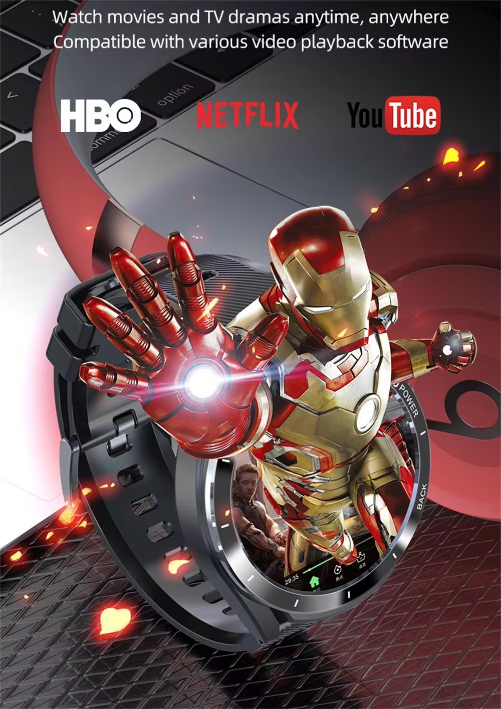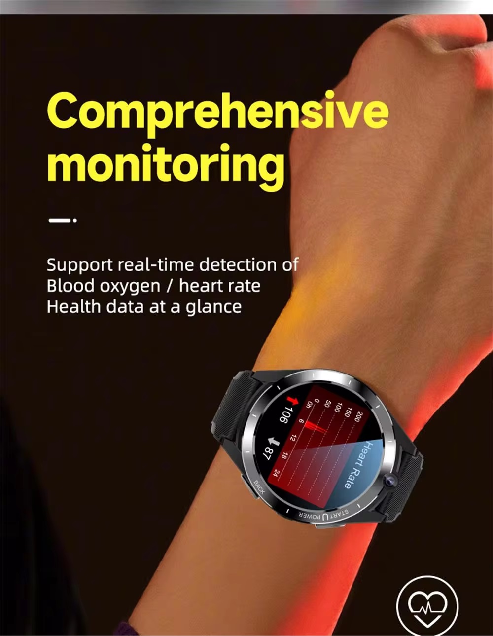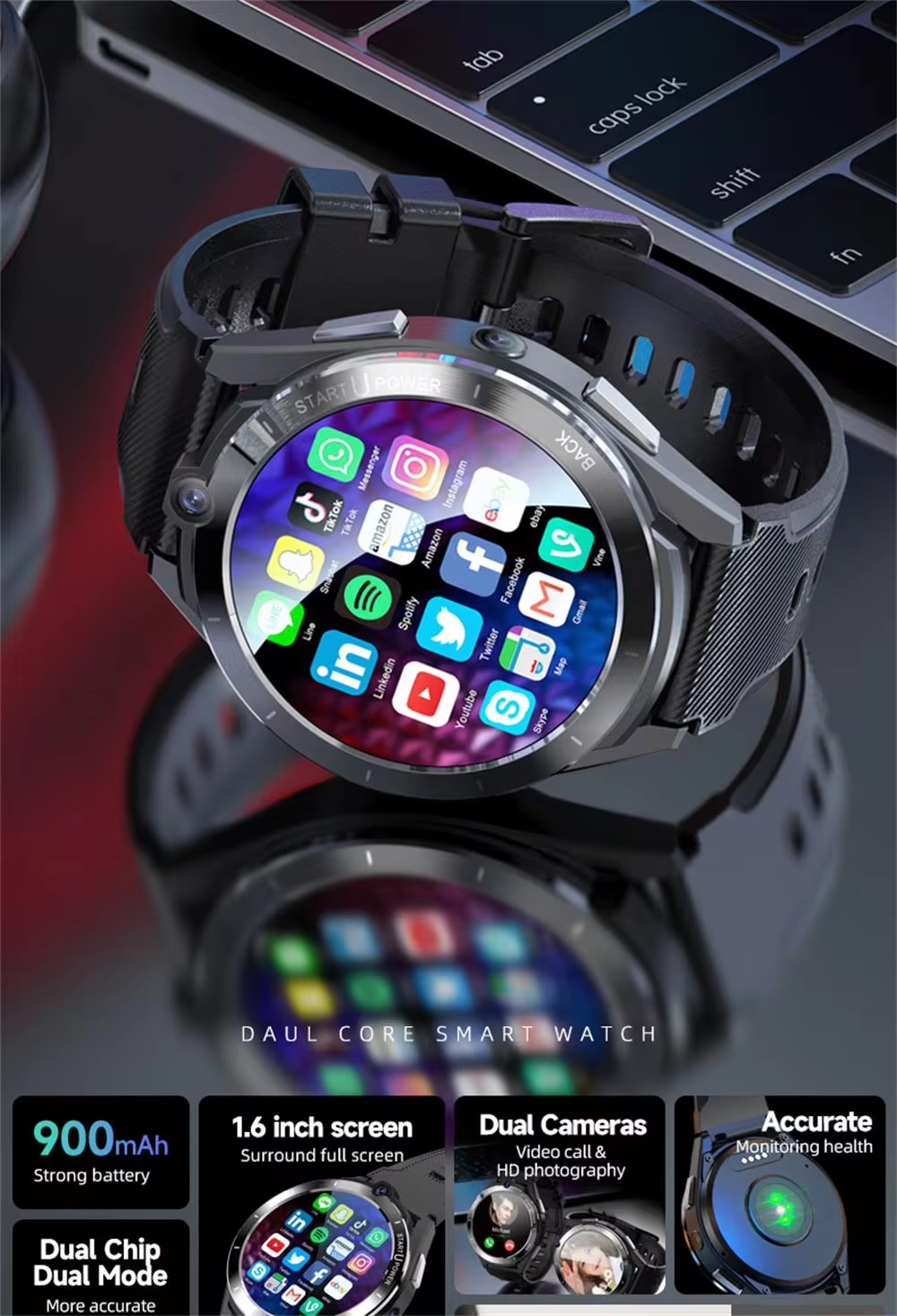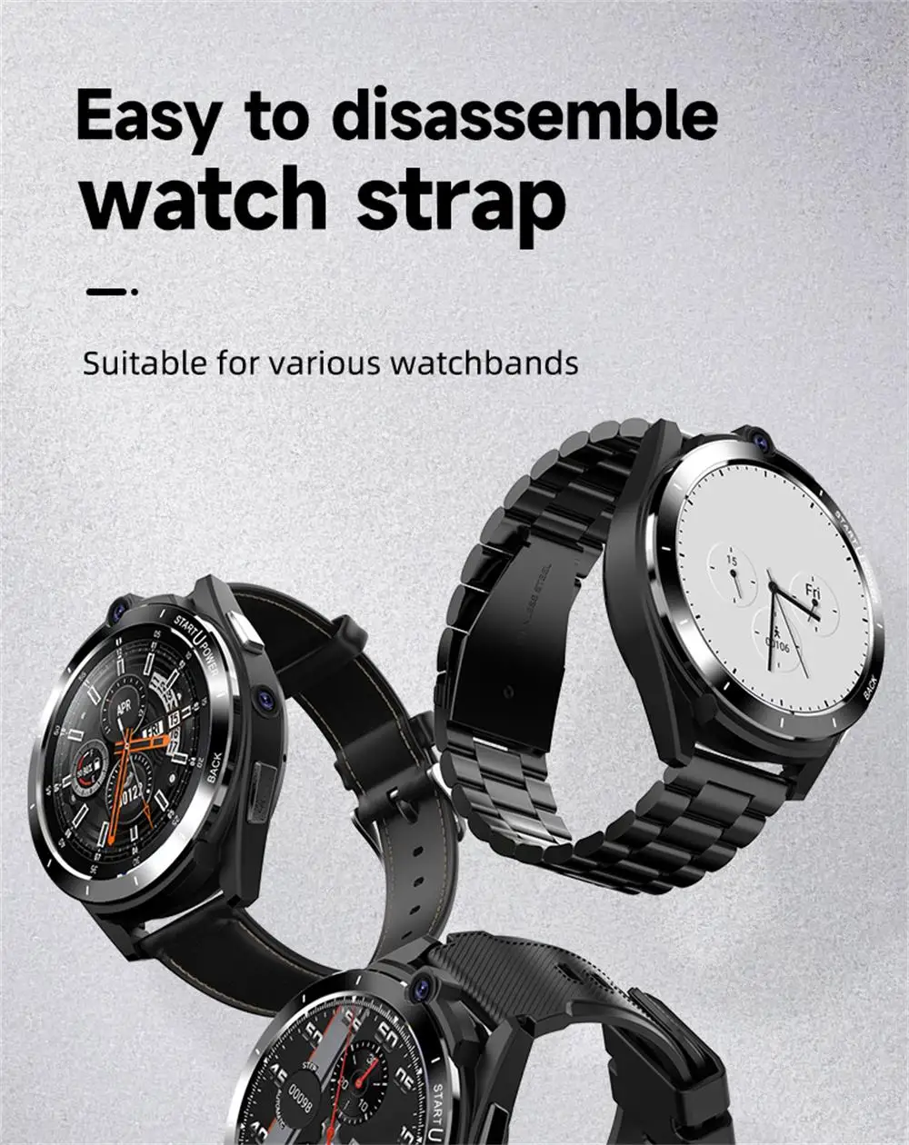 Product parameters: 1.CPU: Ums312+par2822 dual chip. 2.Memory: DDR4 6GB,EMMC:128GB. 3.SIM card: independent standby, hands-free call, nano Sim. 4.Supported frequency band:GSM: 850 / 900 / 1800 / 1900,WCDMA: B1/B2/B5,TD-SCDMA: B34/,LTE-FDD:B1/B2/B3/B5/B7/B8/B12/B17/B20,LTE-TDD:B38/B39/B40/B41(100MHz). 5.Touch screen: 1.6 inch 400*400 resolution HD full round screen. 6.Camera: Top 2million / main 8million HD camera. 7.Bluetooth,Wifi,GPS:support. 8.Heart rate: support. 9.Step counting: supported. 10.Data interface: pogo pin+ magnetic cable / power bank. 11.Battery: smart watch 900mah.