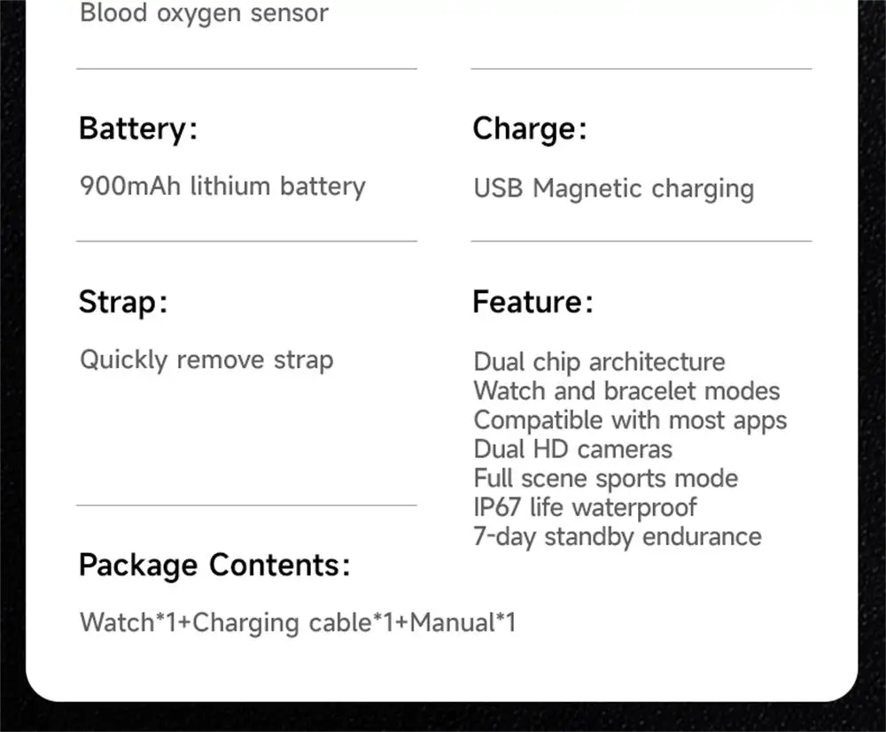1.Operating system:Android 11. 2.Menu bar:Phone, contact, SMS, settings, heart rate, blood oxygen, sleep, breathing training, browser, camera, gallery, calendar, alarm clock, music, recording,File management, weather, sports, desktop settings, system themes, system optimization, dial market, application market, mobile assistant, etc. 3.Sports:Outdoor running, outdoor walking, indoor running, cycling, basketball, football, table tennis, badminton, rope skipping. 4.set up:Network and Internet, connected devices, applications and notifications, battery, display, sound, storage, location information, system, about mobile phones. 5.healthy:Heart rate, blood oxygen, sleep, step counting. 6.Weather:Local weather < plug in SIM card network >. 7.Network and Internet:WLAN, hotspot and network sharing, flight mode, mobile network, traffic saver. 8.Application and notification:Default application, permission manager, special application permission. 9.Mobile assistant:Scan QR code connection; Enable remote shooting, music control, and mobile phone search. 10.Air upgrade::support. 11.clock dial:Watch built-in dial + dial market + custom dial.