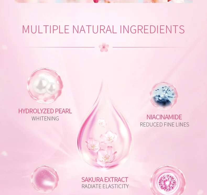 Ingredients: Sakura Extract, Hydrolyzed Collagen Pearl Pearl Hydrolyzed, Nicotinamide, Sodium Hyaluronate and so on …