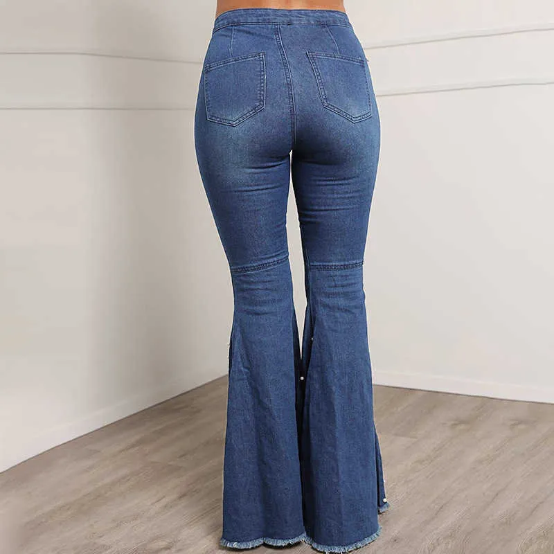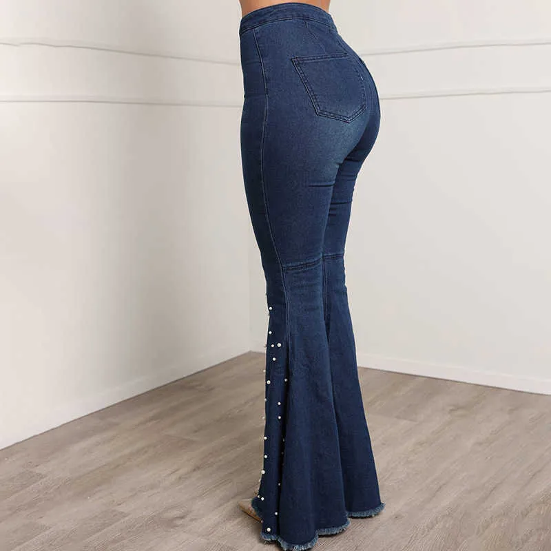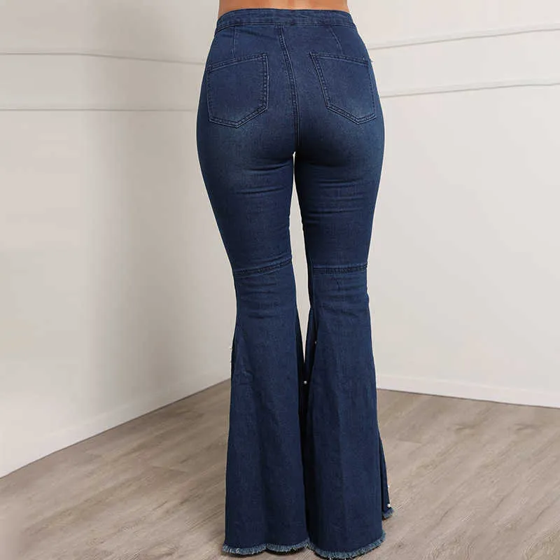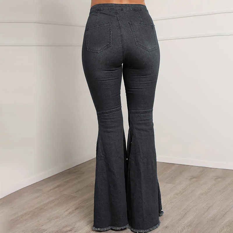 Solid Beading Flared High Waist Casual Denim Bell-Bottom Pant