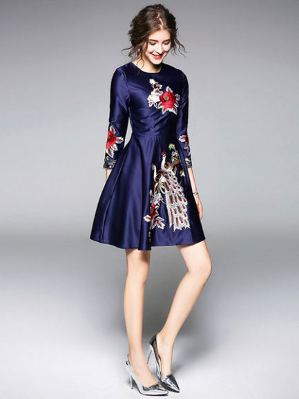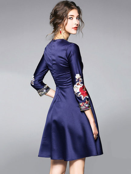 Be the first to review “Blue Party Dress Women Skater Dress Round Neck 3/4 Length Sleeve Embroidered Flare Dress”