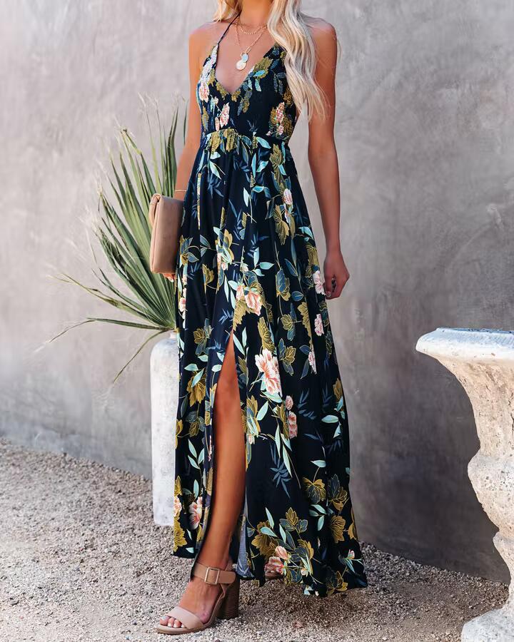 Strap Backless Deep V Neck Fashion Floral Split Banquet Maxi Dresses