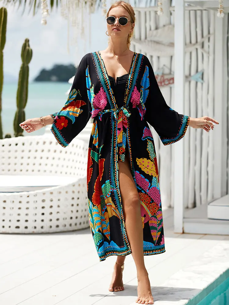 Bohemian Printed Belt Kimono Plus Size Batwing Sleeve Loose Beachwear Swimsuit