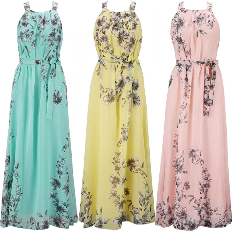 Long Dresses Beach Floral Print Soft Chiffon Boho Maxi Dress