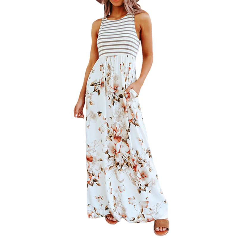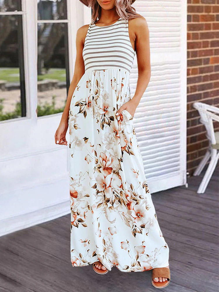 Be the first to review “Casual Floral Print Striped Patchwork Maxi Dress”