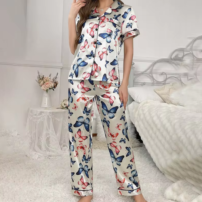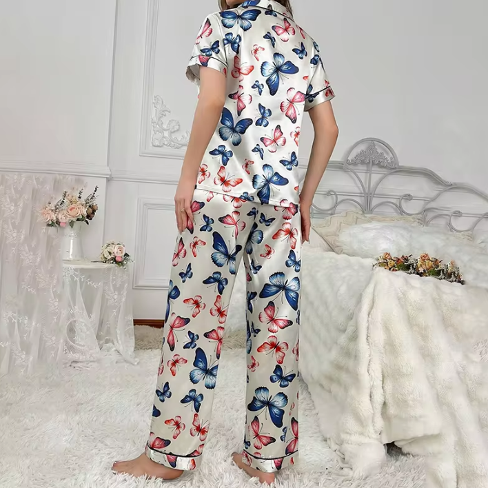 Butterfly Print Satin Collared Neck Shirt and Pants 2 Piece Set