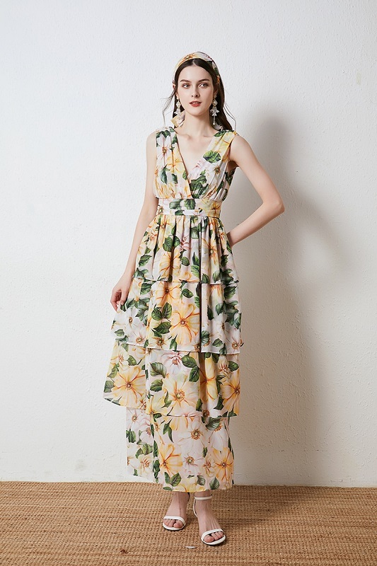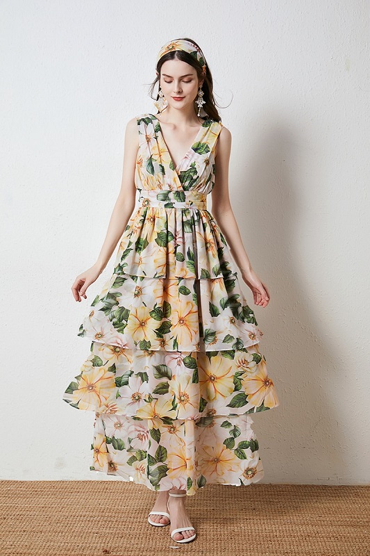 Camellia Floral Print Sleeveless V-Neck Long Cake Dress