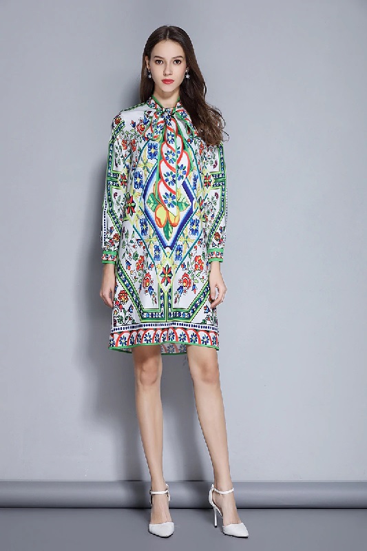 Casual Bow Tie Long Sleeve Shirt Dress