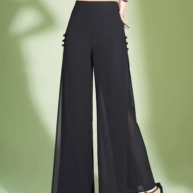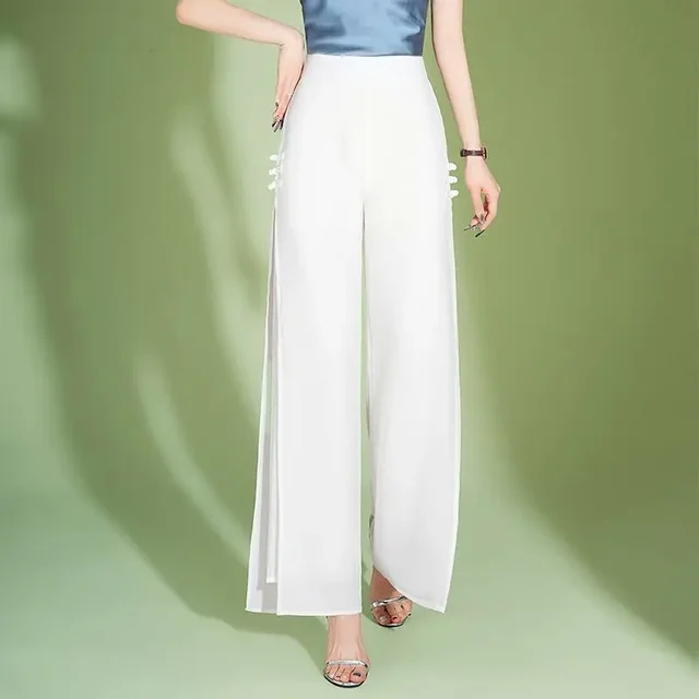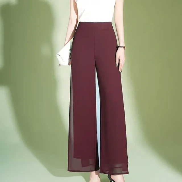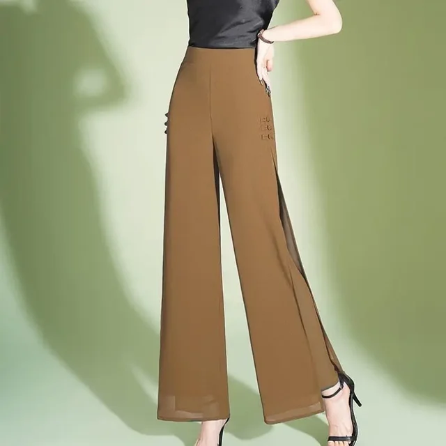 Casual Double Layer Elastic High Waist Button Chiffon Straight Trousers