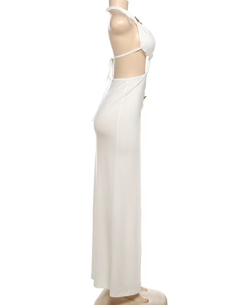 Casual Hollow Split Metal Butterflies Sleeveless Backless Bandage Whip Split Maxi Bodycon Dress
