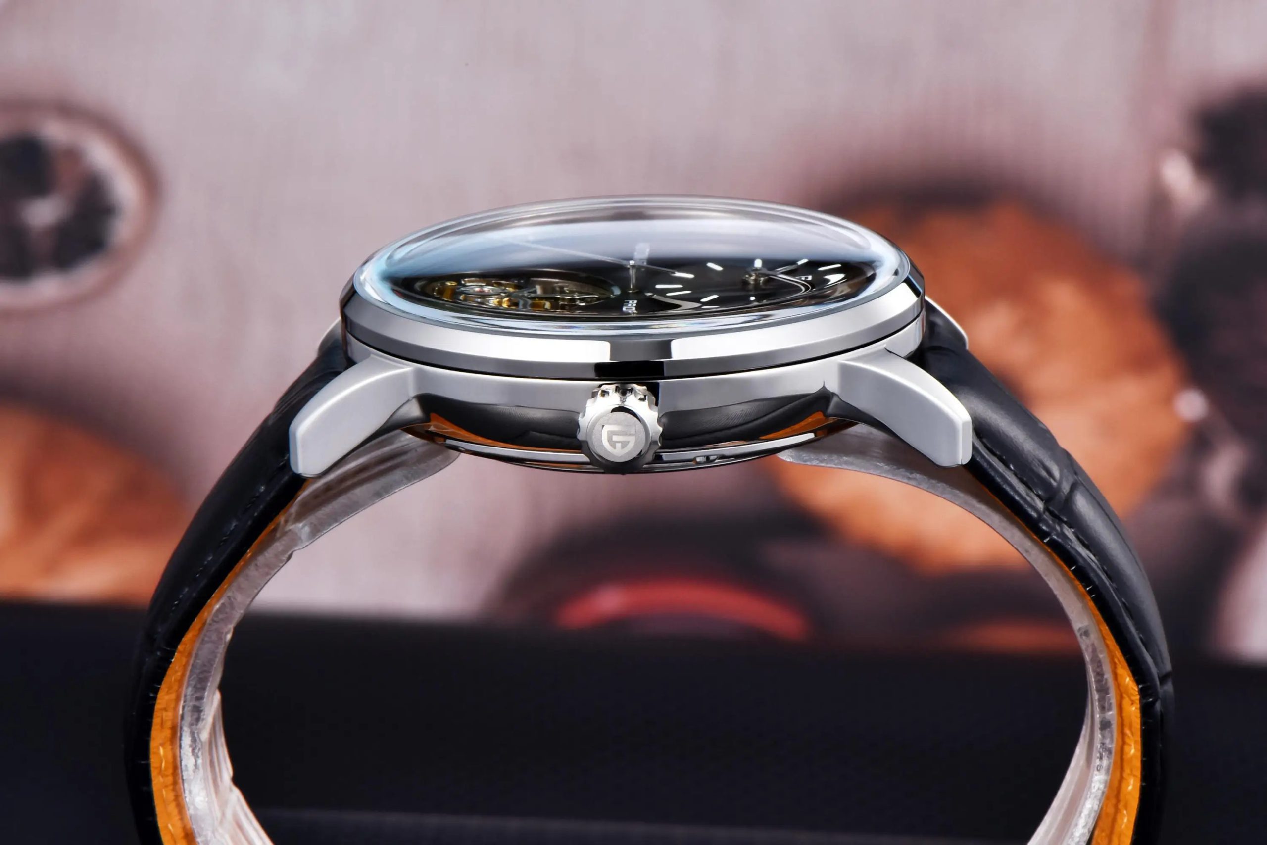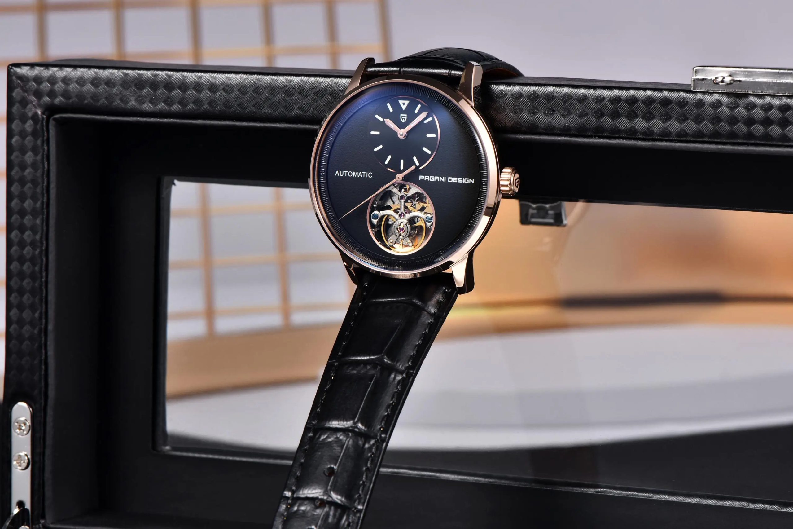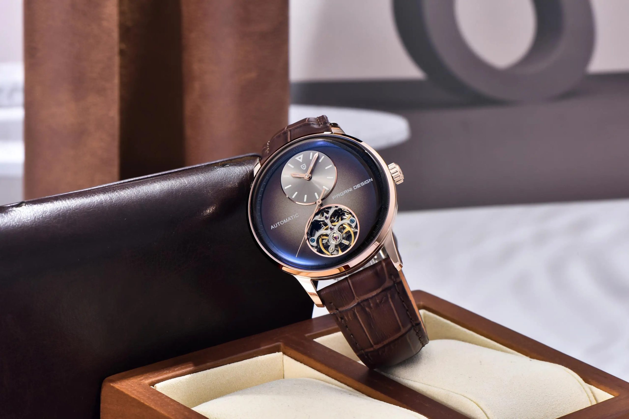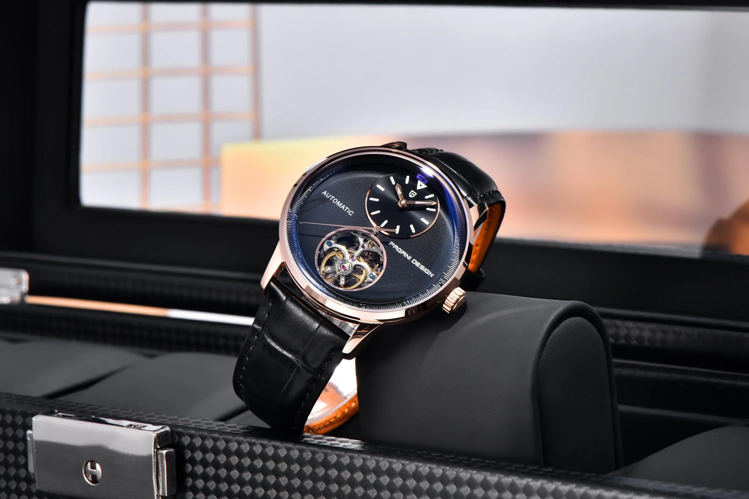 Casual Mechanical Watch Automatic Movement Tourbillon Stainless Steel 100m Waterproof PU Leather Strap Watch