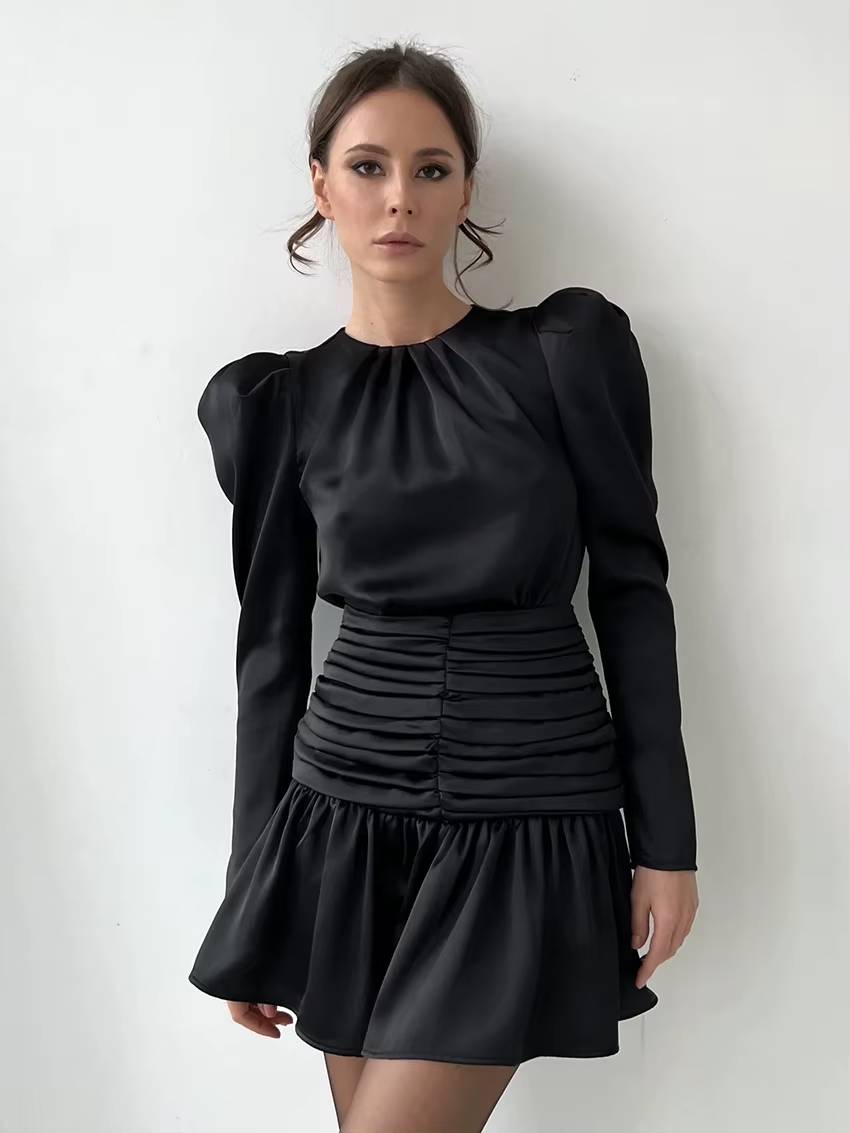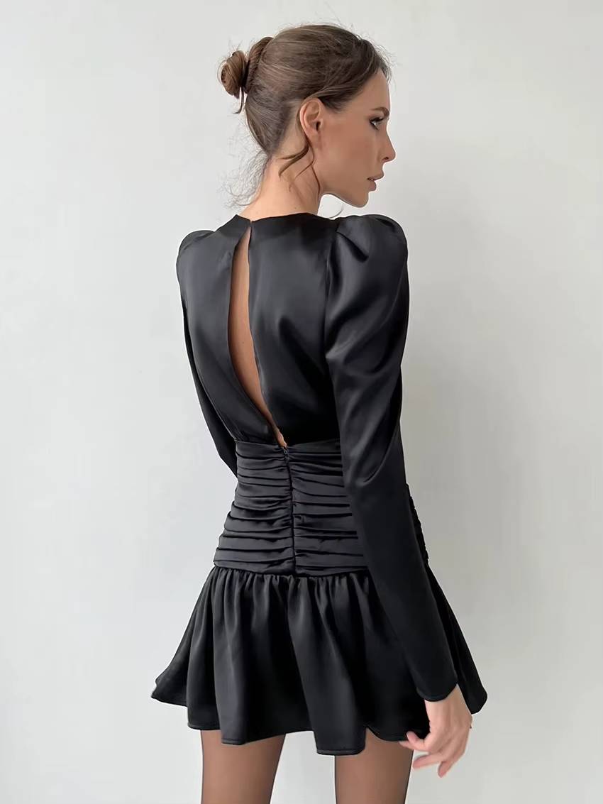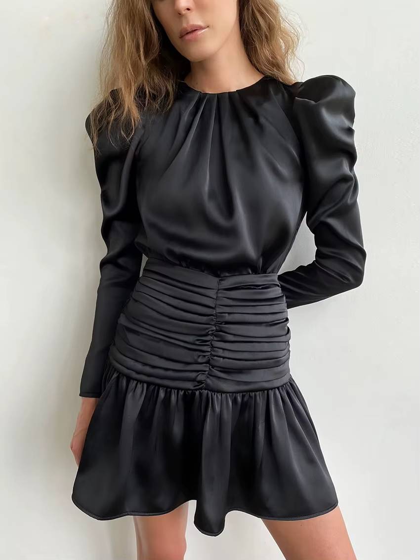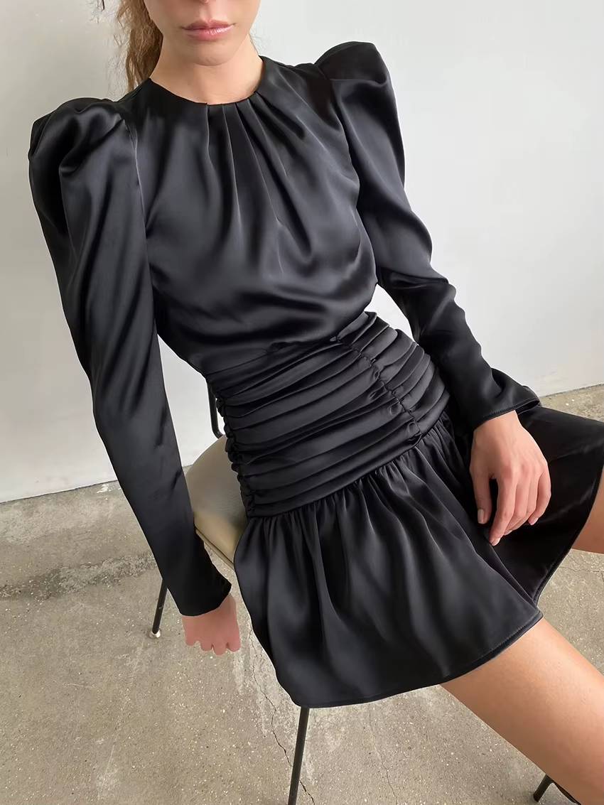 Be the first to review “Casual O-Neck Long Sleeve High Waist Ruched Slim Satin Mini Dress”
