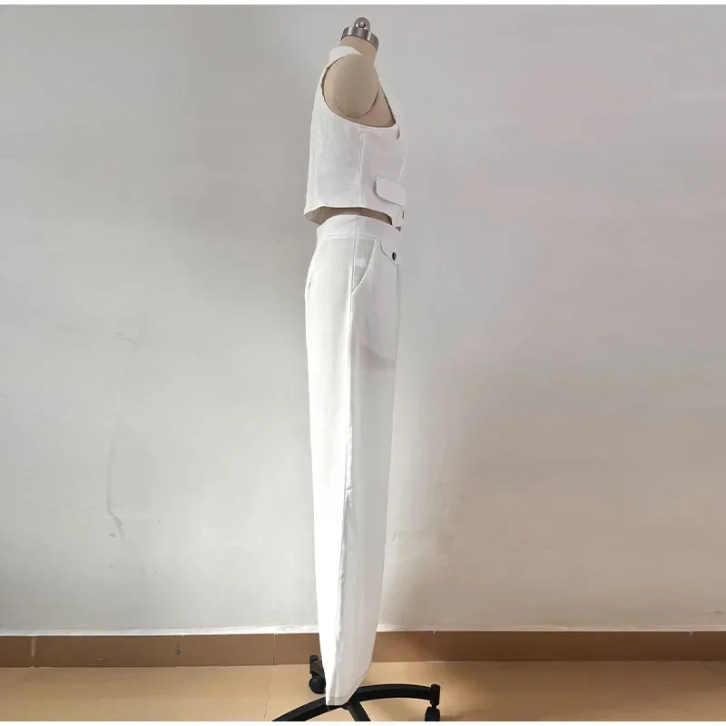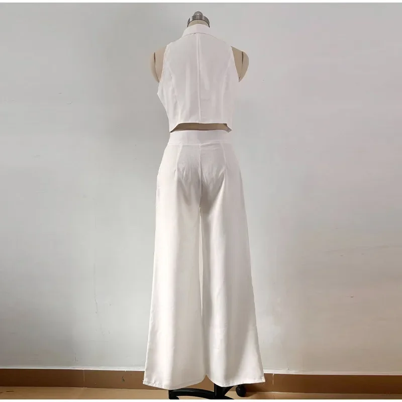 Casual Short Vest Top Pants Suit Button Up Lapel Tops Wide Leg Zipper Pants Suit