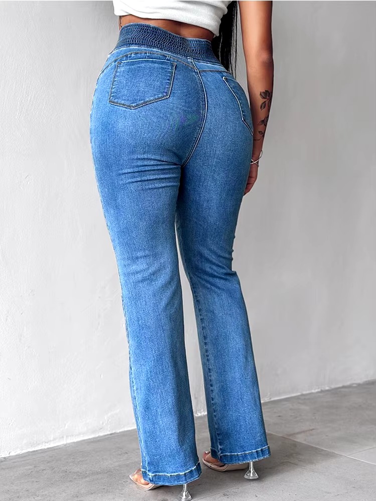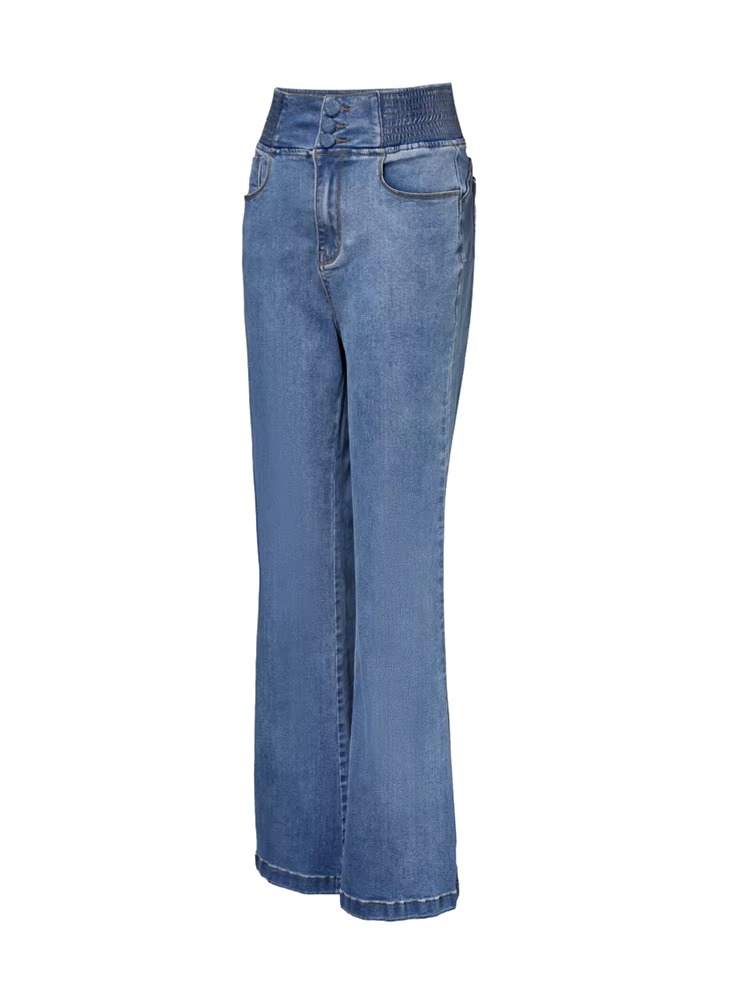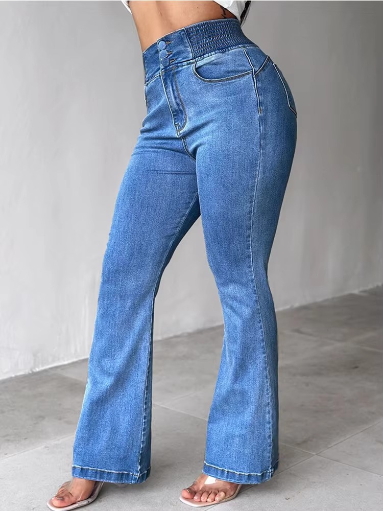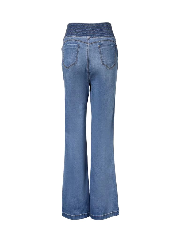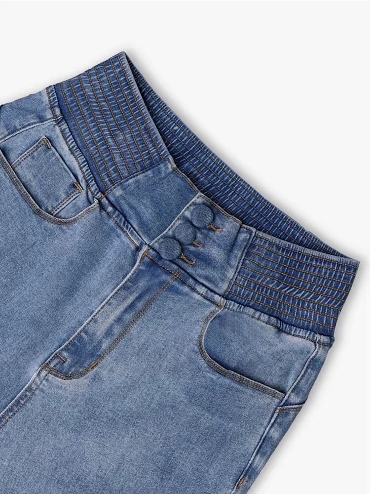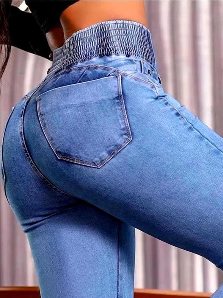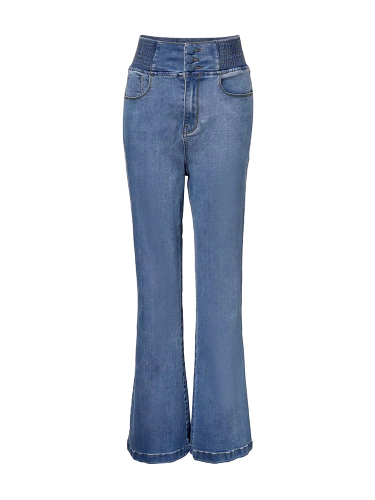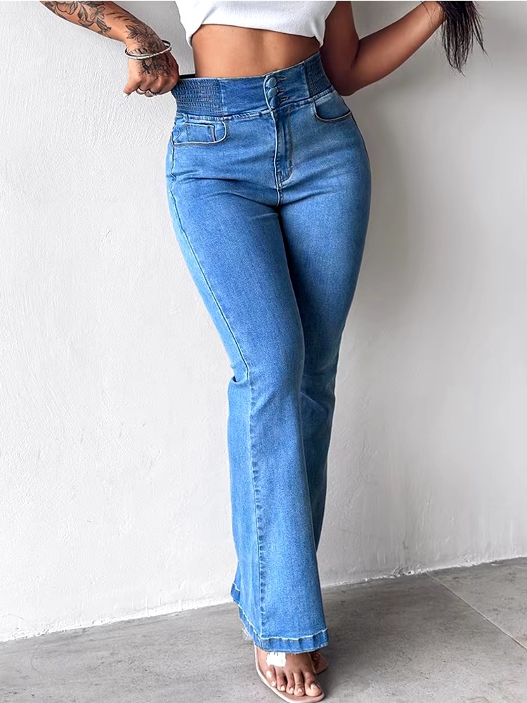 Casual Solid button fly Back Shirred Button Front High Waist Jeans