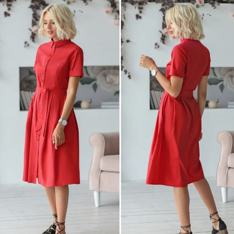 Casual Turn Down Collar Short Sleeve Midi Dress