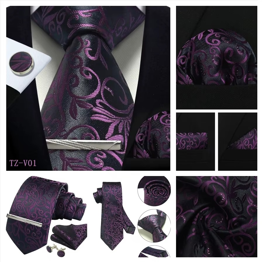 Ties Type Neck Tie Set: Comes complete with a pocket square, cufflinks, and tie clip, making it a refined accessory ensemble.