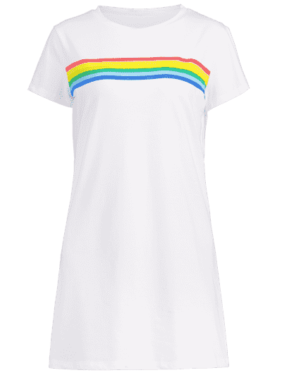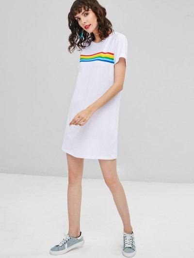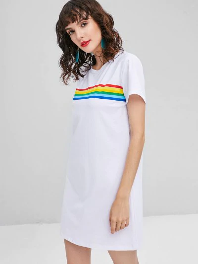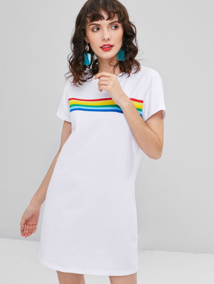 The best choice of the casual dress is the unique tee dress, just like this short-sleeved t-shirt dress. Designed with the panel of the colorful stripes design along the center of the bodice to add some fun hues, it is an easy summer style that is versatile for most of the occasions from the beach strolls to the brunch events.