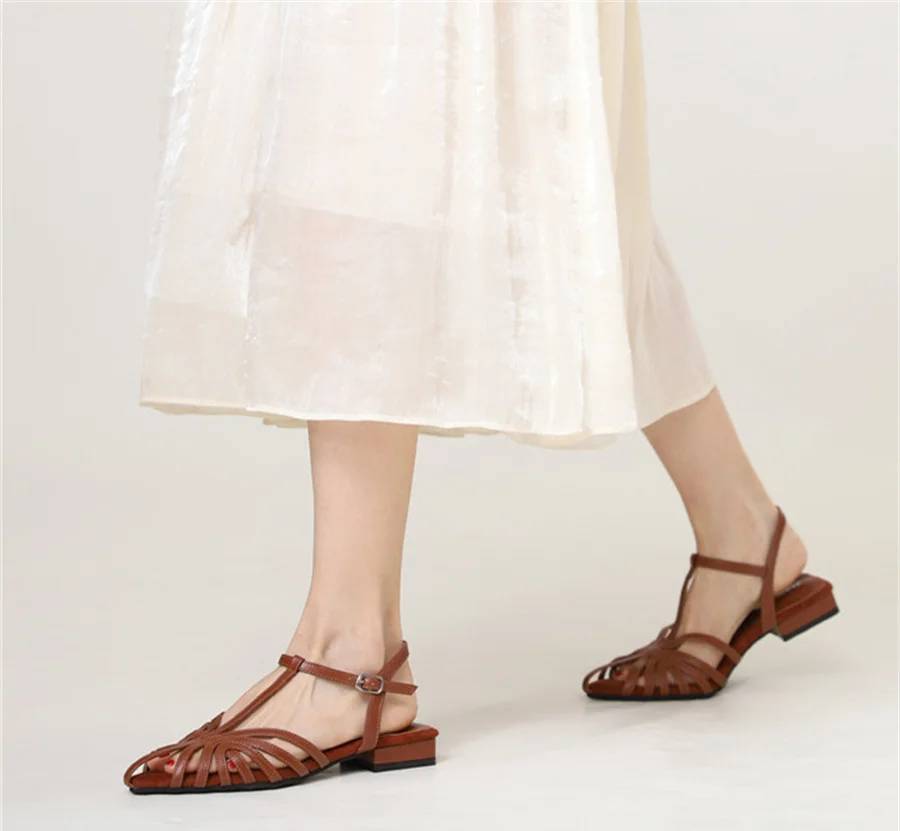 Be the first to review “Concise Pointed Toe Cross Tied Hollow Narrow Band Square Low Heel Sandals”