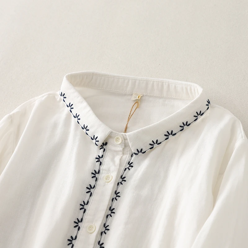 Cotton and Linen Embroidered Long Sleeve Sense Elegant Loose Casual Shirt
