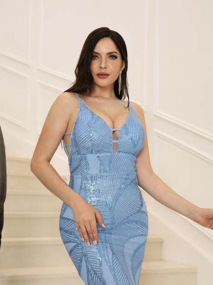 Deep V-neck Spaghetti Strap Blue Sequin Dress