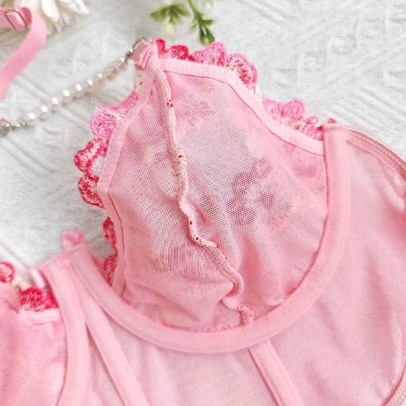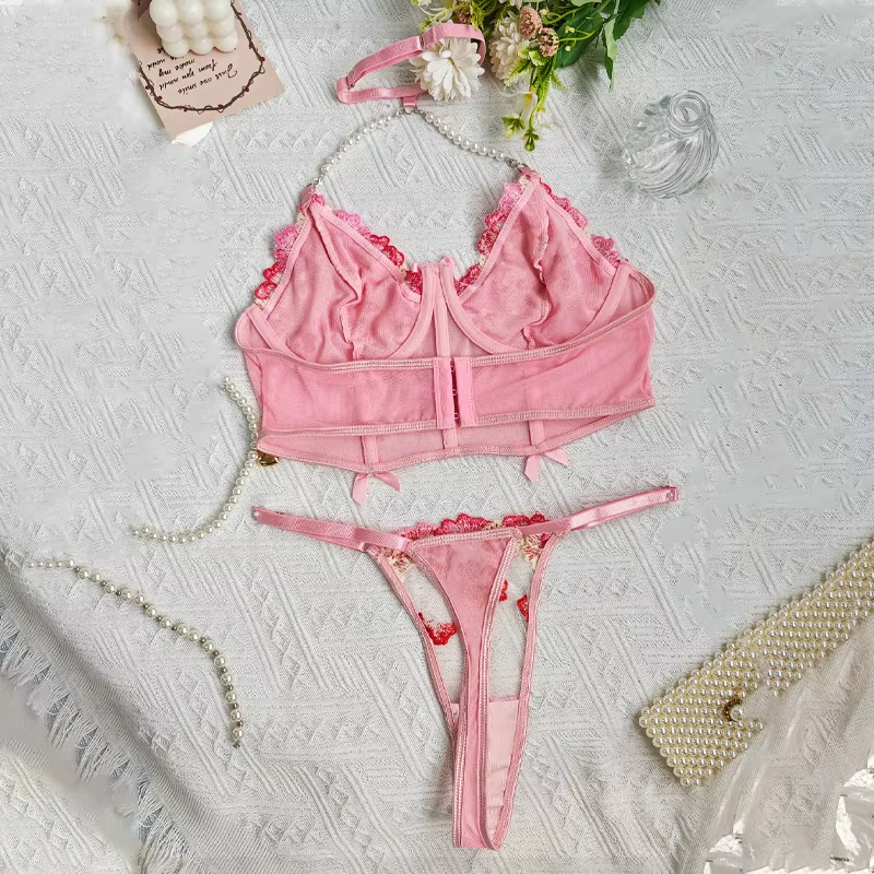 Delicate Embroidery Pearl Halter Underwear Exotic Bra Set
