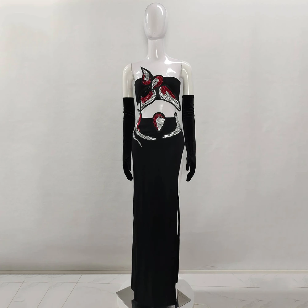 Diamond Set Tank Top With High Spilt Skirt And Gloves Party Cocktail Set