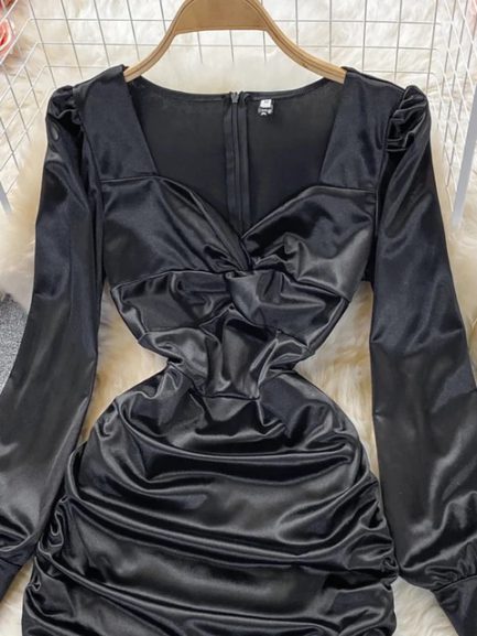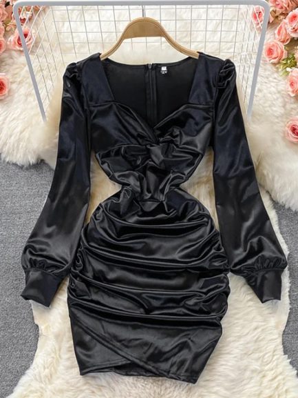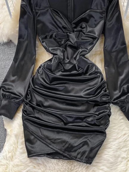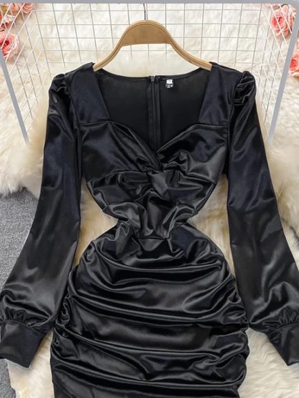 Be the first to review “Draped Satin Square Collar Long Sleeve Dress”