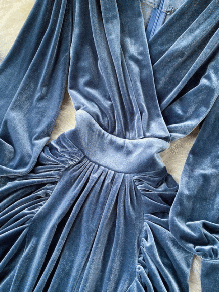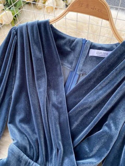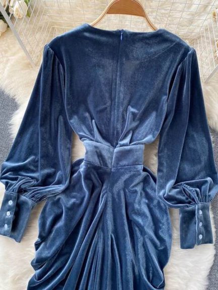 Draped V-Neck Lantern Sleeve High Waist Dress