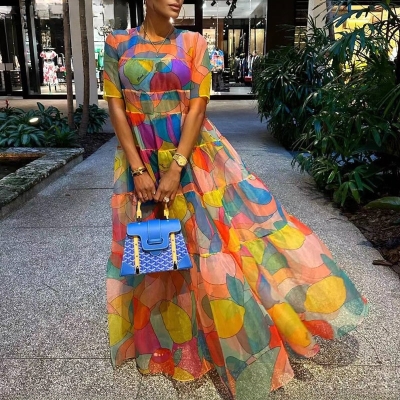 Elegant All Over Print Round Neck Short Sleeves Tierred Maxi Beach Party Sexy Vacation Dress