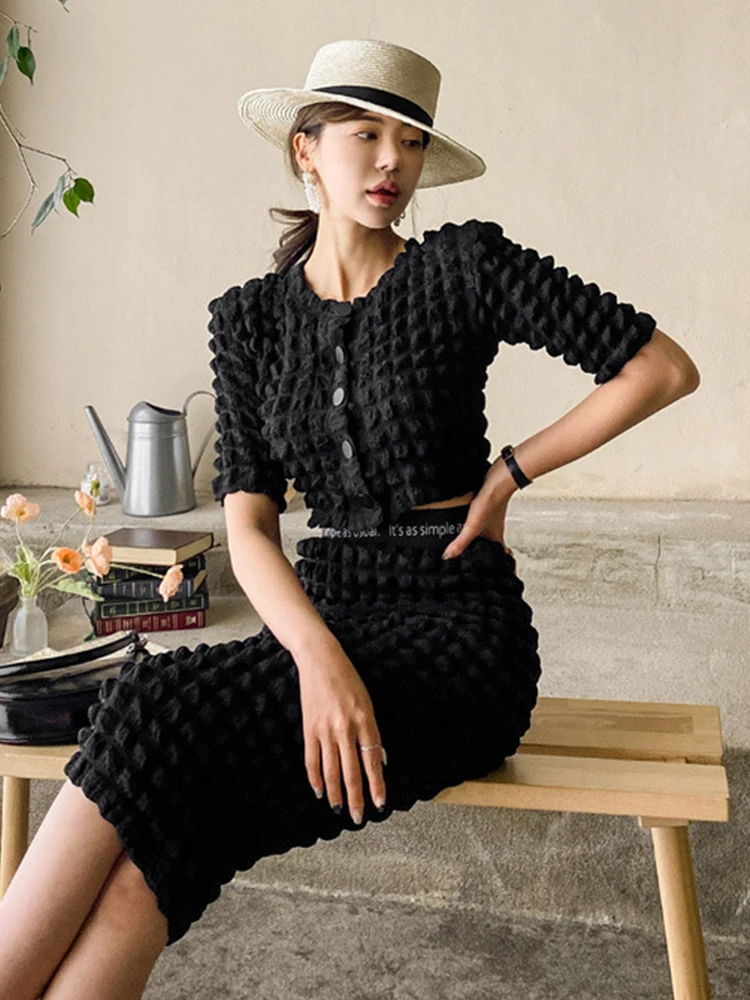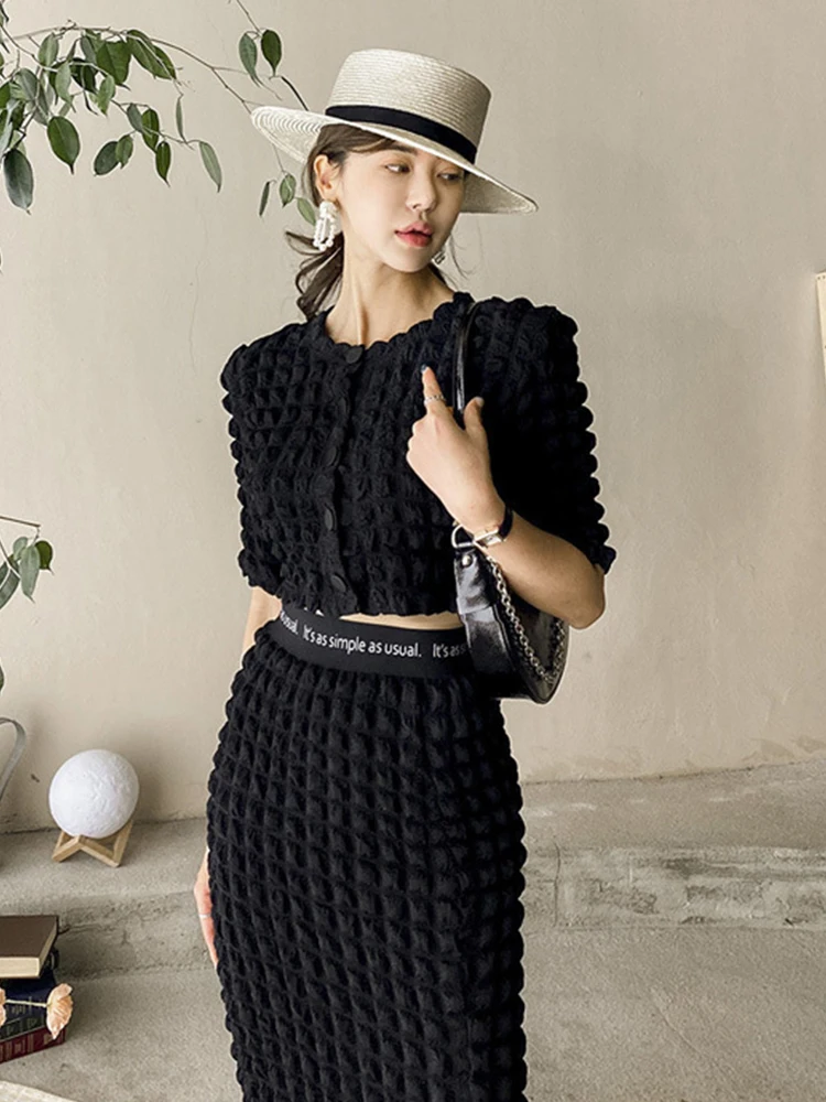 Elegant Chic O-Neck Short Cropped Tops Shirt Blouse High Waist Midi Skirt 2 Piece Outfits