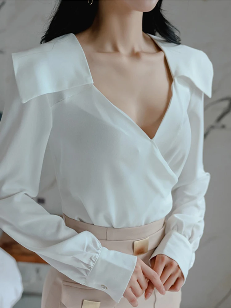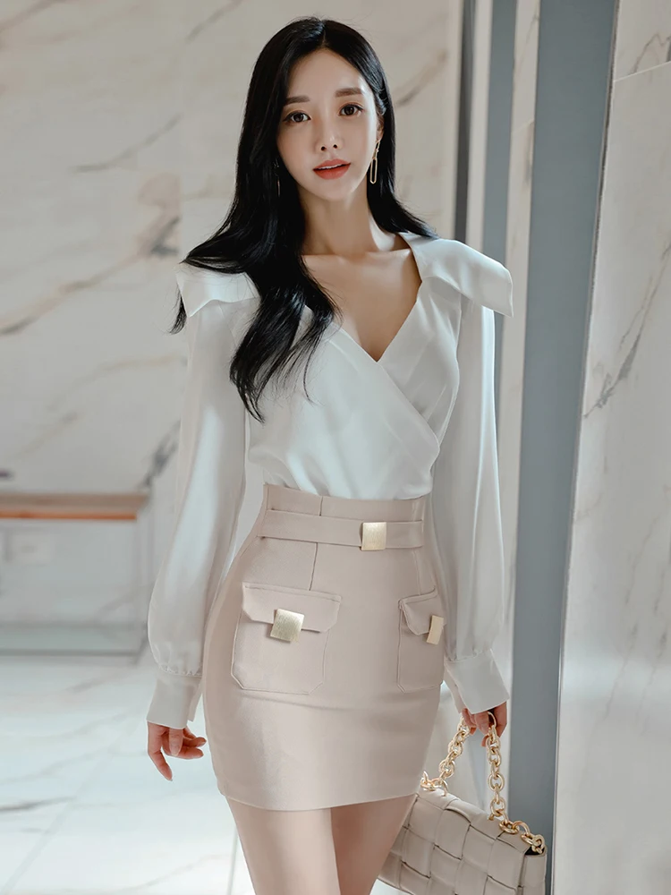 Elegant Chic V-Neck Tops Shirt Blouse High Waist Mini Skirt 2 Pieces Outfits